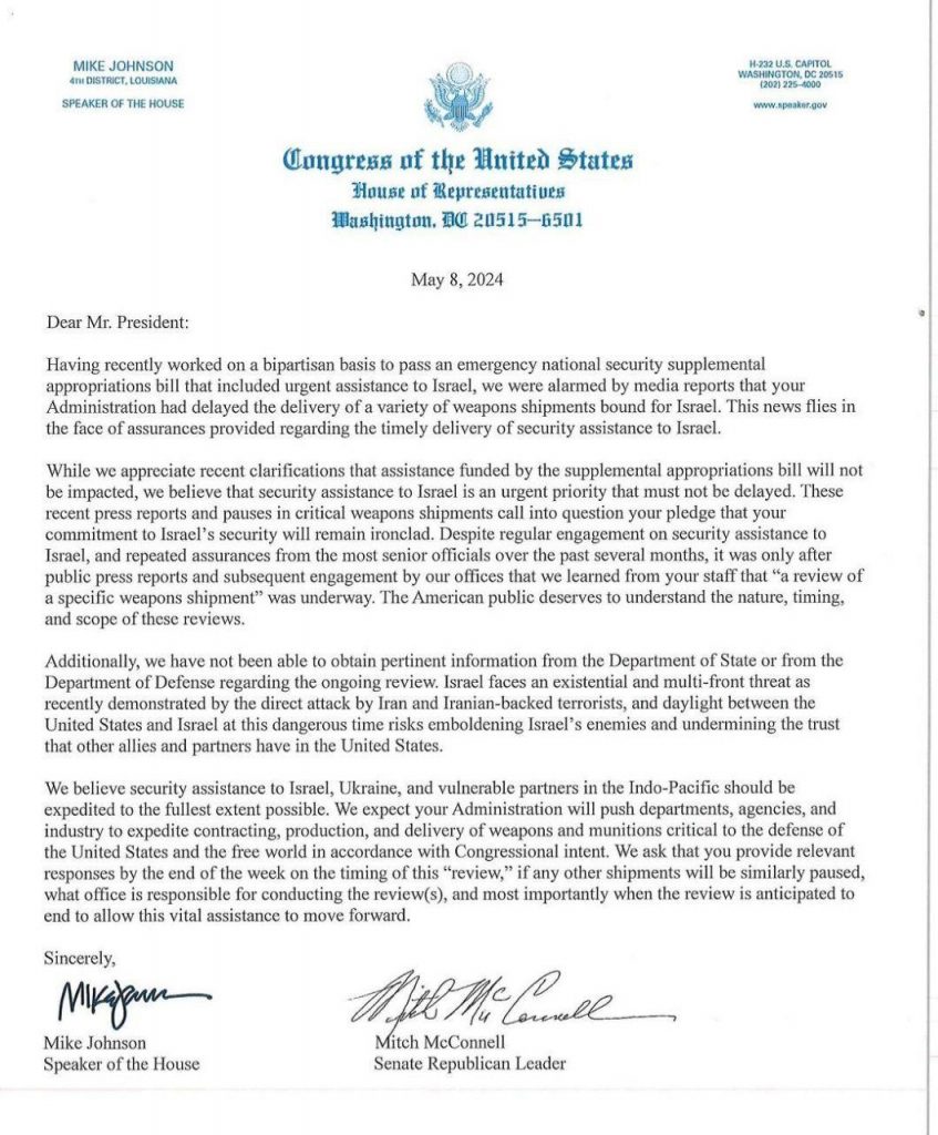 Liderii republicani din Congres într-o scrisoare către președintele Biden: „Întârzierea transportului de arme pune sub semnul întrebării angajamentul față de securitatea Israelului”