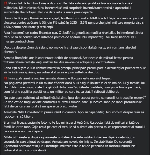 Mesajul include și o componentă politică explicită. Mihai Fifor îl acuză pe Ilie Bolojan de „inventivitate toxică” și susține că „sesiunile foto nu te fac ministru al Apărării”, sugerând că respectul și grija față de militari ar trebui să fie prioritare.